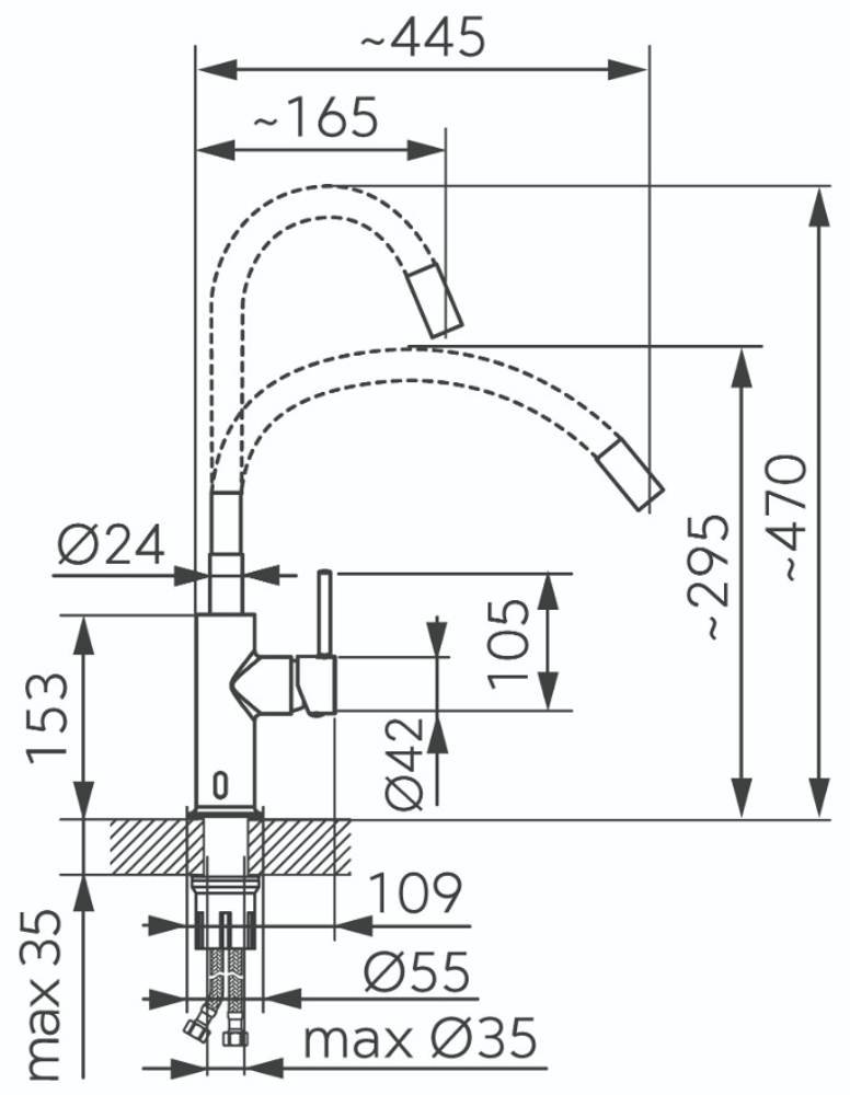 Dosah výtokového ramena: 165 - 445 mm