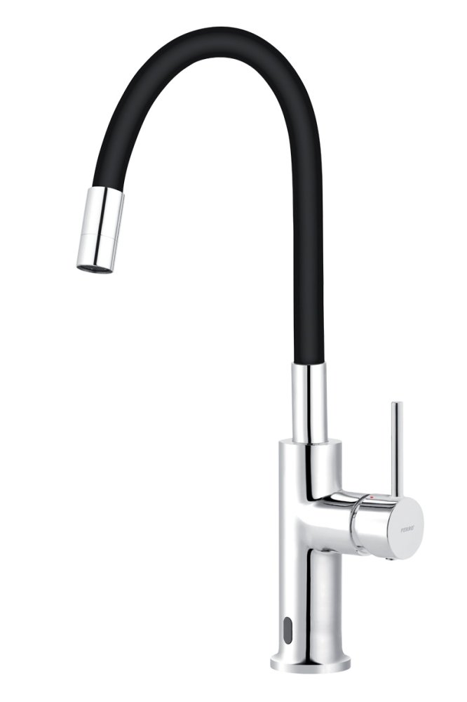 Moderná senzorová drezová batéria NOVASERVIS DISTANZA s flexibilným ramenom v kombinácii čierna/chróm ponúka maximálnu hygienu, úsporu vody a dokonalú flexibilitu pri práci v kuchyni.