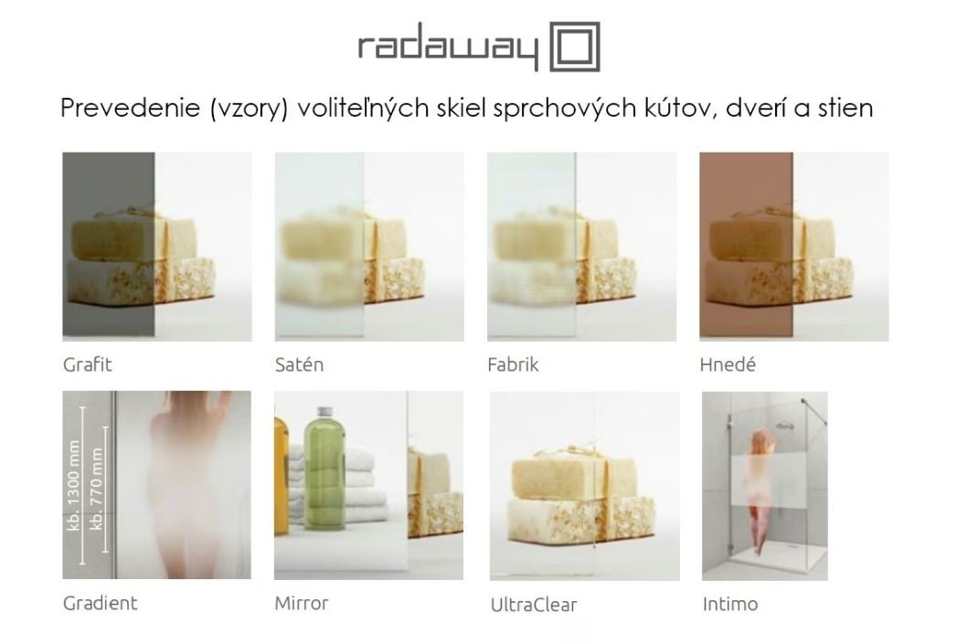 ***Sprchový kút je možné na požiadanie dodať aj v inom prevedení skla (viď obrázok / vzorkovník). Nakoľko je to atypické prevedenie je požadovaná platba vopred. Keďže cenu za takéto prevedenie je potrebné vypočítať konkrétne pre každý rozmer sprhového kútu, je cena len na vyžiadanie.