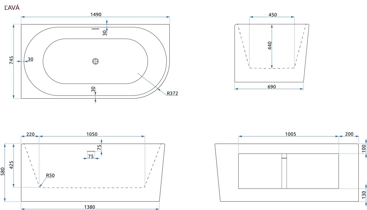 Rea BELLANTO SYDNEY voľne stojaca akrylátová vaňa / prístenná 150 x 75 cm W0250 - Vaňa - ľavá