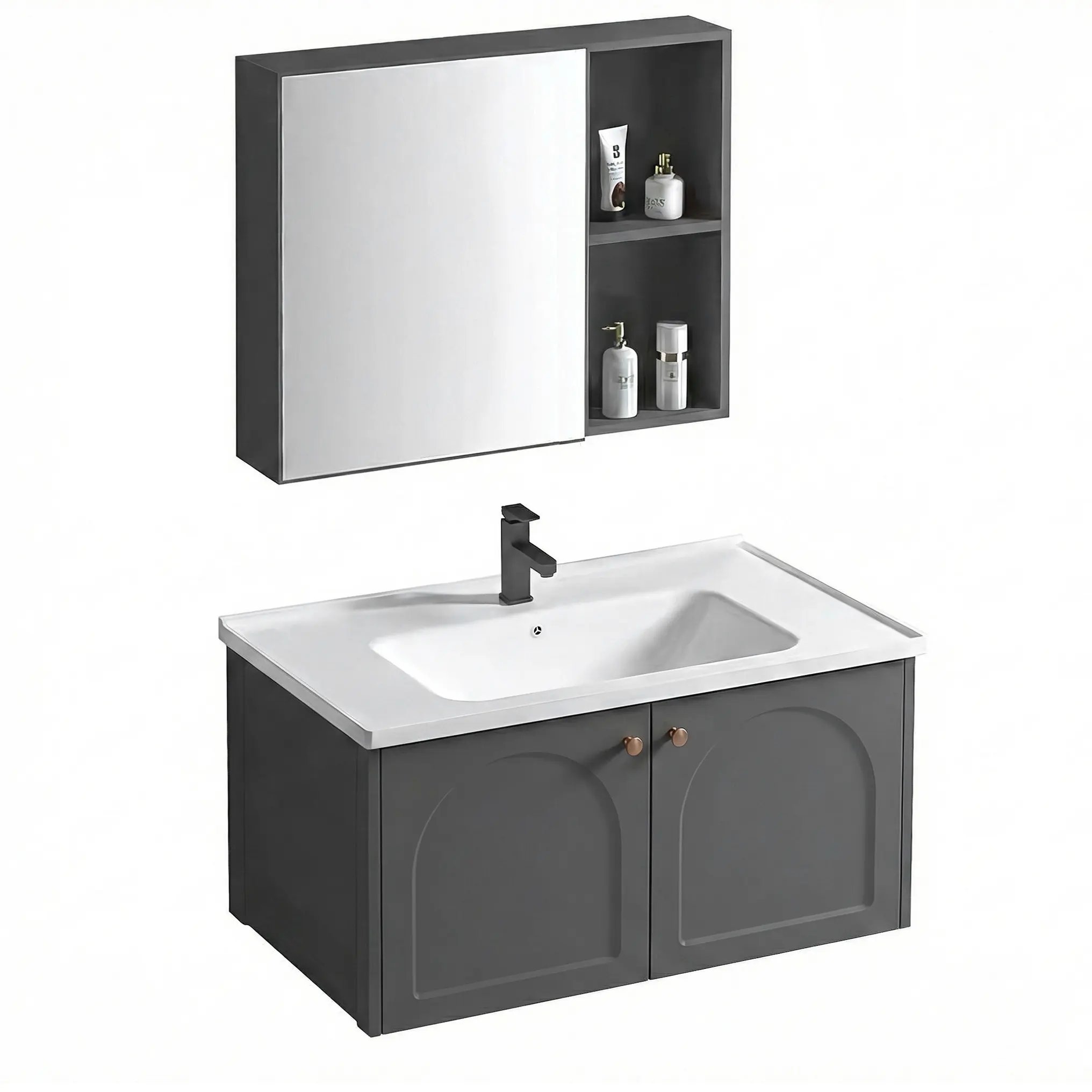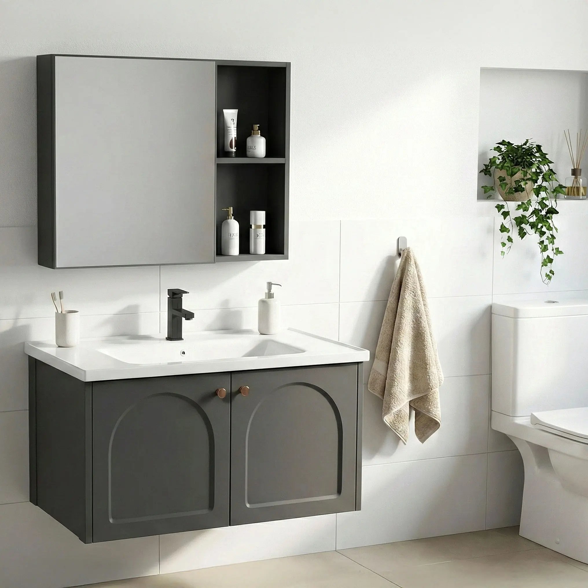 Kúpeľňový set Denver 80 cm Grey je kompaktný a praktický nábytkový komplet, ktorý skvele doplní modernú kúpeľňu s dôrazom na štýl, úložný priestor a jednoduchosť údržby.
