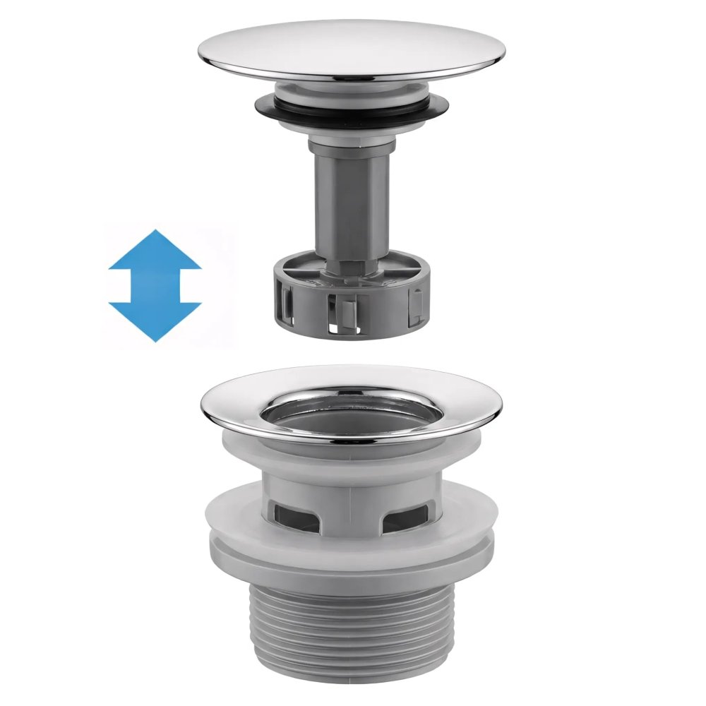 Uzáver Click-Clack s vyberateľnou vložkou – mechanizmus typu „push-open“ umožňuje zatváranie a otváranie odtoku jedným stlačením. Hlavnou výhodou je možnosť úplného vybratia vrchnej vložky korka, čo umožňuje rýchle odstránenie vlasov a usadenín zhora bez potreby demontáže sifónu pod umývadlom.