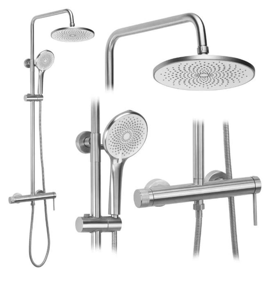 Komplexné riešenie: batéria, hlavová sprcha, ručná sprcha, sprchový stĺp a držiak — všetko v jednom balení.