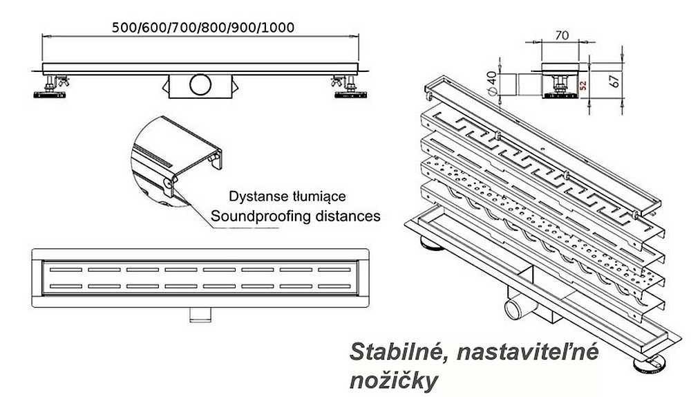 Land GREEK nerezový sprchový žľab komplet s mriežkou šírka 600 mm