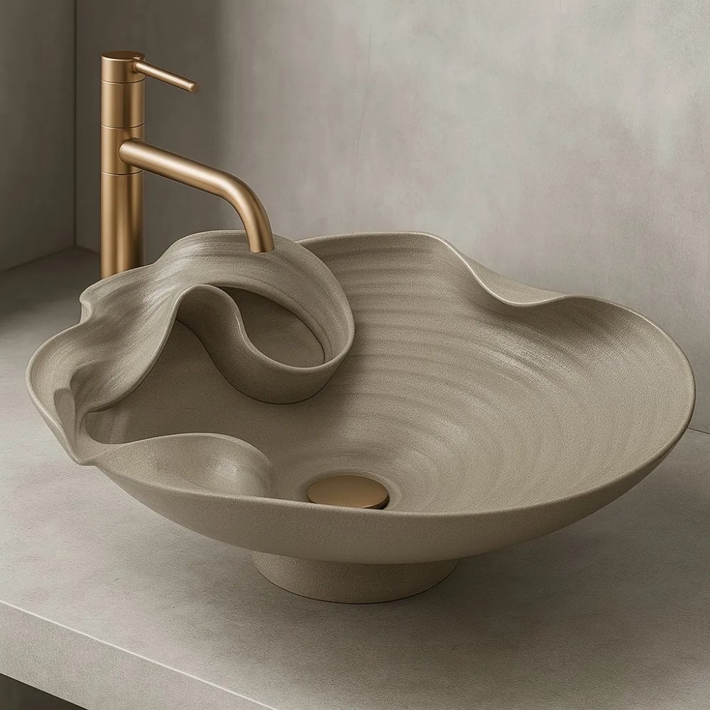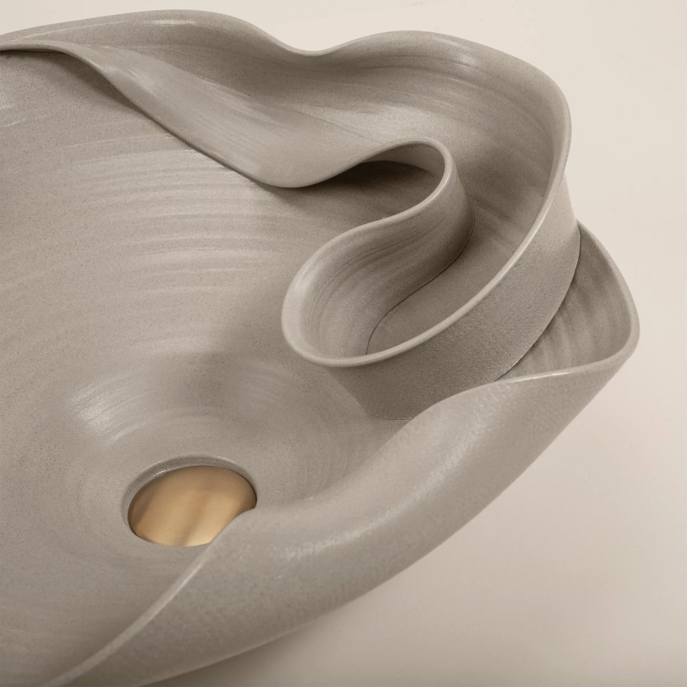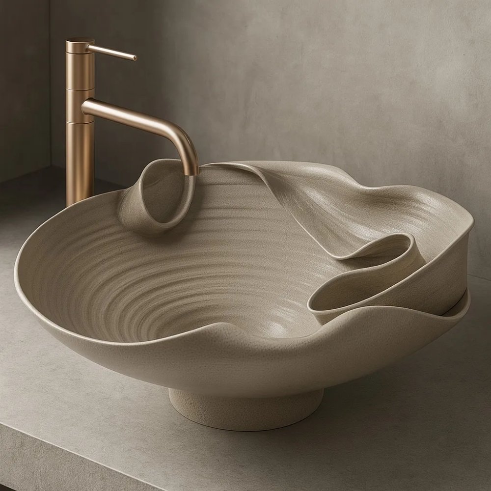 Dizajn umývadla je výrazný — pripomína špirálovité záhyby, ktoré evokujú formáciu skaly, vlnu alebo prirodzené zakrivenia materiálu. Vďaka tomu sa stáva dominantným prvkom v kúpeľni, nielen praktickým, ale aj estetickým. Suverínna textúra v kombinácii s béžovo-matným povrchom harmonizuje s modernými materiálmi ako je betón, sklo, kov či kameň.