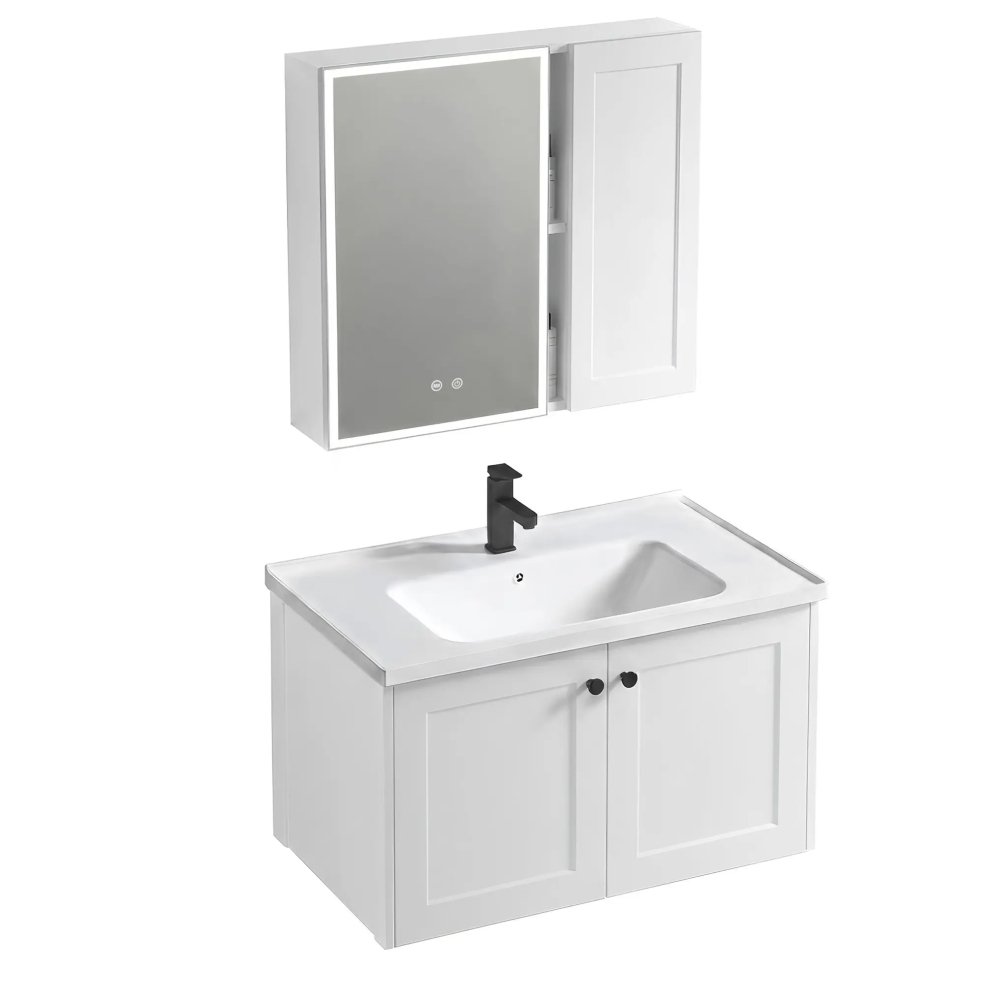 Elegantný kúpeľňový nábytkový set Monti 60 cm v bielom prevedení je kompletné riešenie pre zariadenie modernej kúpeľne. Set pozostáva zo závesnej umývadlovej skrinky, keramickej umývadlovej misy a hornej skrinky so zrkadlom LED s funkciou anti-fog. Tento praktický komplet ponúka dostatok úložného priestoru, opticky zväčšuje priestor a zvyšuje komfort pri každodennom používaní kúpeľne.