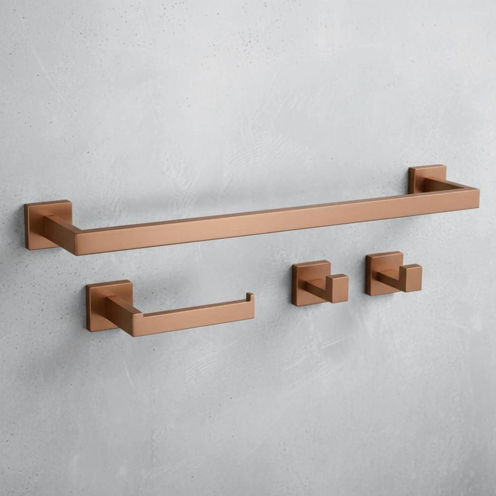 Sada kúpeľňových doplnkov Rio Brush Copper 4 kusy je ideálnym doplnkom pre vašu kúpeľňu, ak hľadáte spojenie elegancie, praktickosti a trvácnosti. Každý prvok súpravy je vyrobený z pevného kovu s kvalitnou brúsenou povrchovou úpravou, ktorá je odolná voči vlhkosti a korózii – dizajnovo tak výborne zapadne do moderných interiérov aj priestorov s vysokou vlhkosťou.