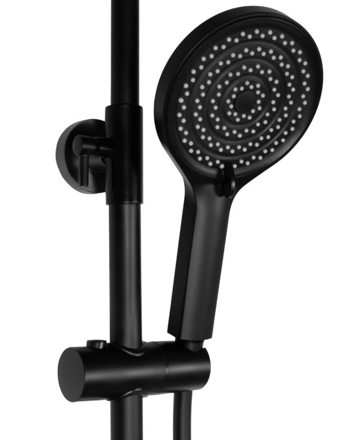 Sprchový stĺp s nastaviteľnou výškou od 840 do 1200 mm zaisťuje flexibilitu a prispôsobenie podľa výšky používateľa. Súčasťou setu je ručná sprchová hlavica, sprchová hadica, horná dažďová sprcha s rozmermi cca 250×250 mm a pevná vaňová výlevka — takže súprava pokrýva všetky potreby: rýchle opláchnutie, komfortné sprchovanie aj napúšťanie vane.