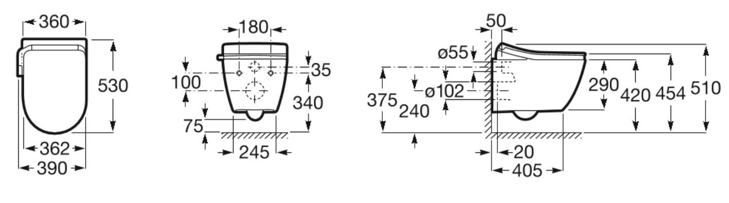 Technicky je toaleta riešená s dôrazom na spoľahlivosť – má prietokový ohrievač vody, pracuje pri tlaku vody 0,1 – 0,7 MPa, výkon zariadenia je 1650 W a krytie IPX4, čo umožňuje bezpečnú prevádzku v kúpeľňovom prostredí. Prívod vody je riešený zozadu vľavo, odpaduje vodorovne a splachovanie prebieha európskym systémom 3 / 4,5 l.