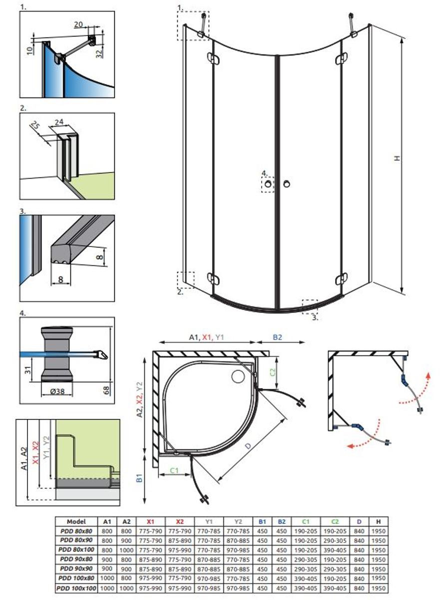 Radaway TORRENTA PDD štvrťkruhový sprchový kút 80 x 80 x 195 cm