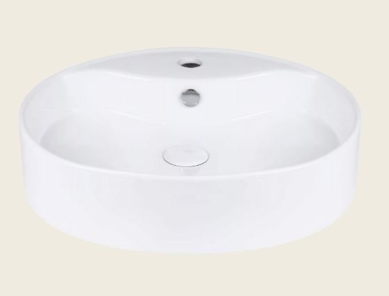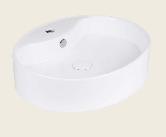 Moderné oválne umývadlo na dosku s centrálnym otvorom pre batériu a prepadom, vhodné do štýlových a funkčných kúpeľní.