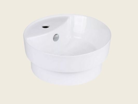 Keramické okrúhle umývadlo vhodné na montáž na dosku aj ako zapustené, s otvorom pre batériu a prepadom.