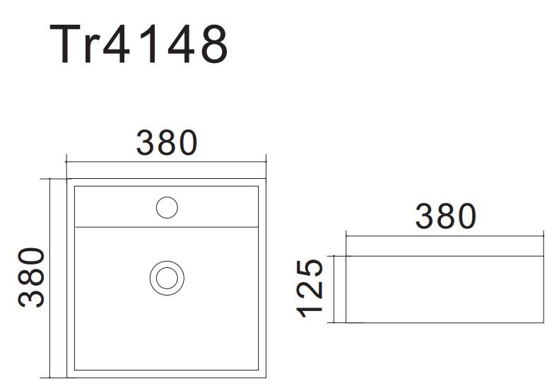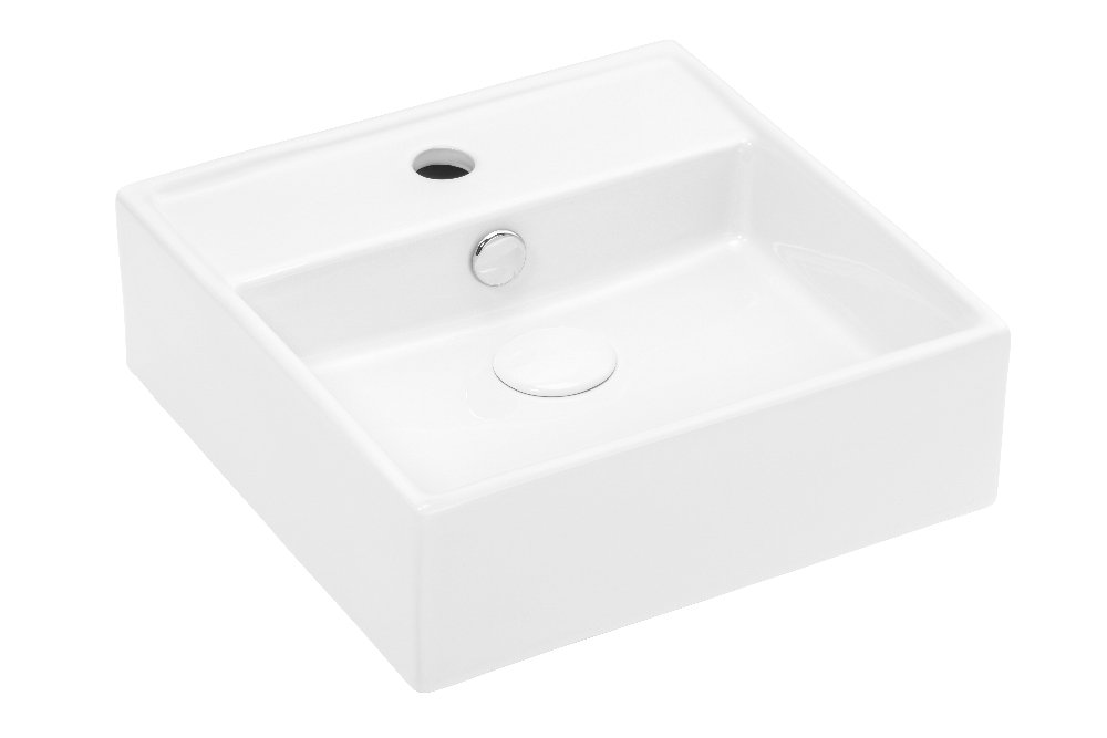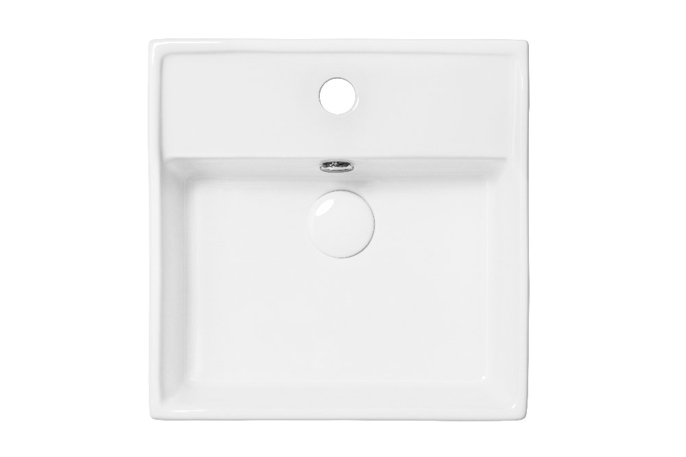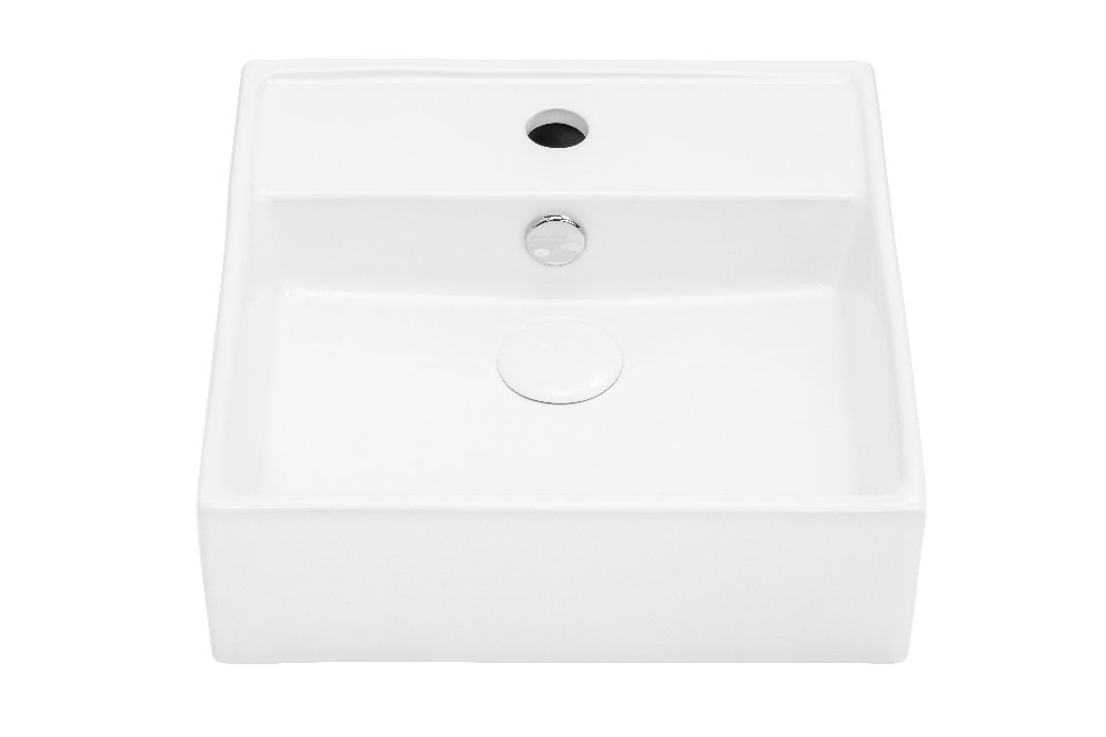 Keramické štvorcové umývadlo s otvorom pre batériu a prepadom, vhodné na montáž na dosku alebo na stenu.