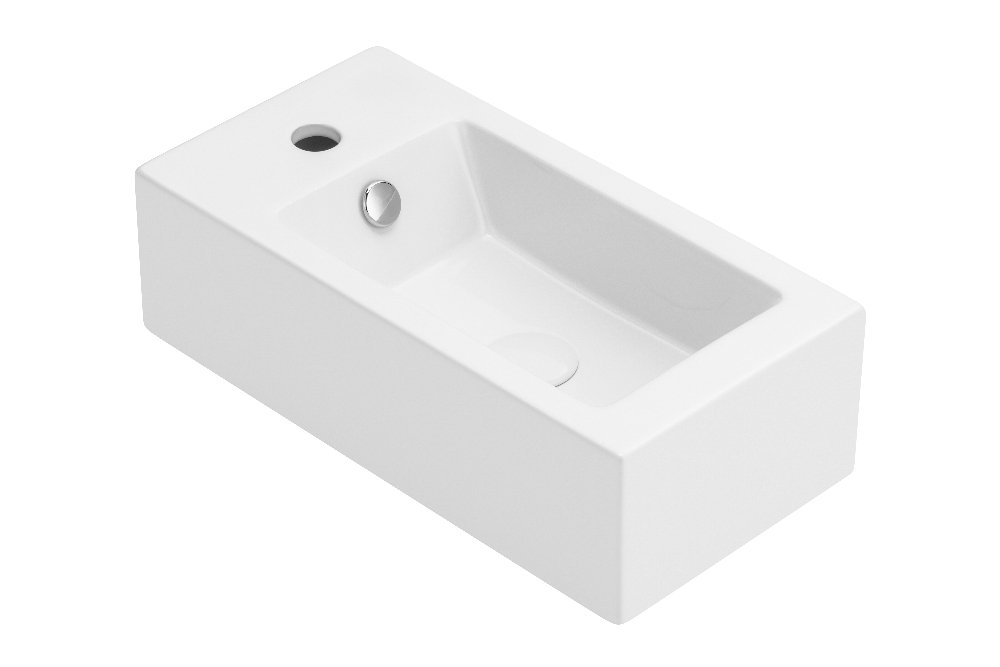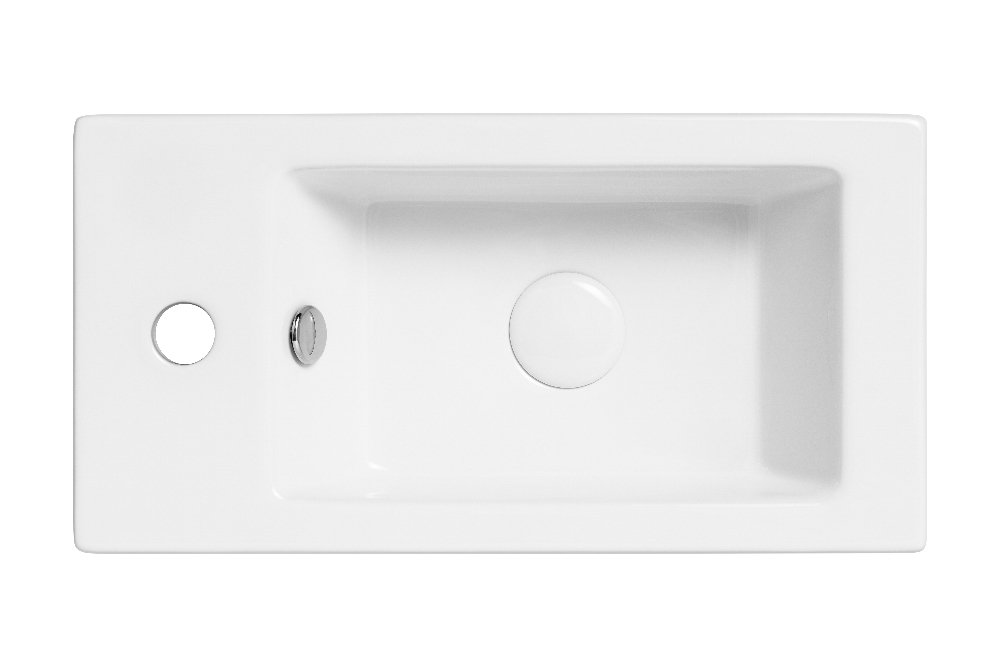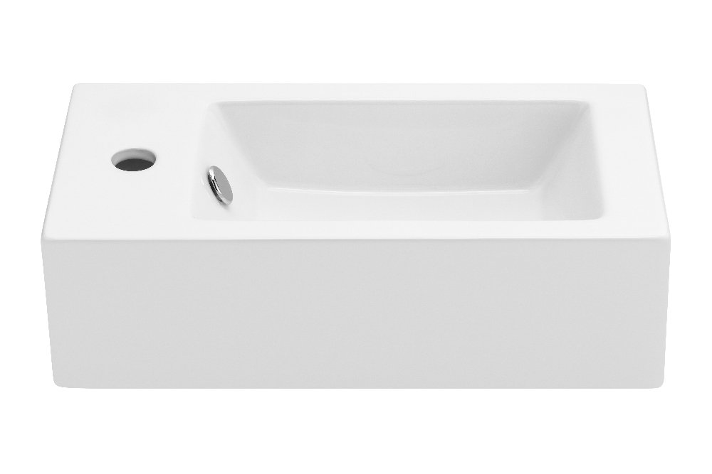 Kompaktné ľavé umývadlo vhodné na stenu aj na dosku – ideálne pre menšie kúpeľne a toalety.