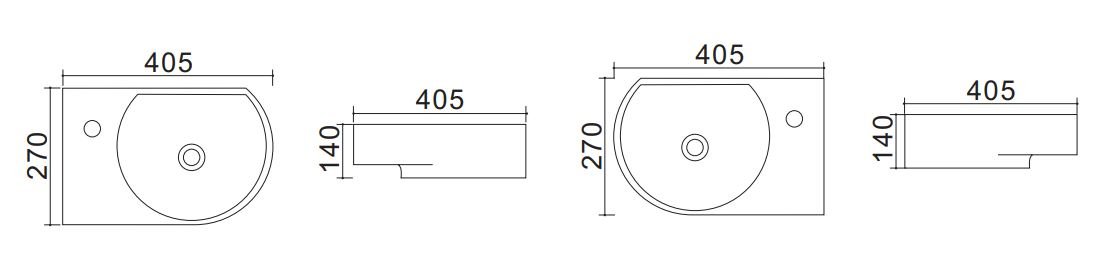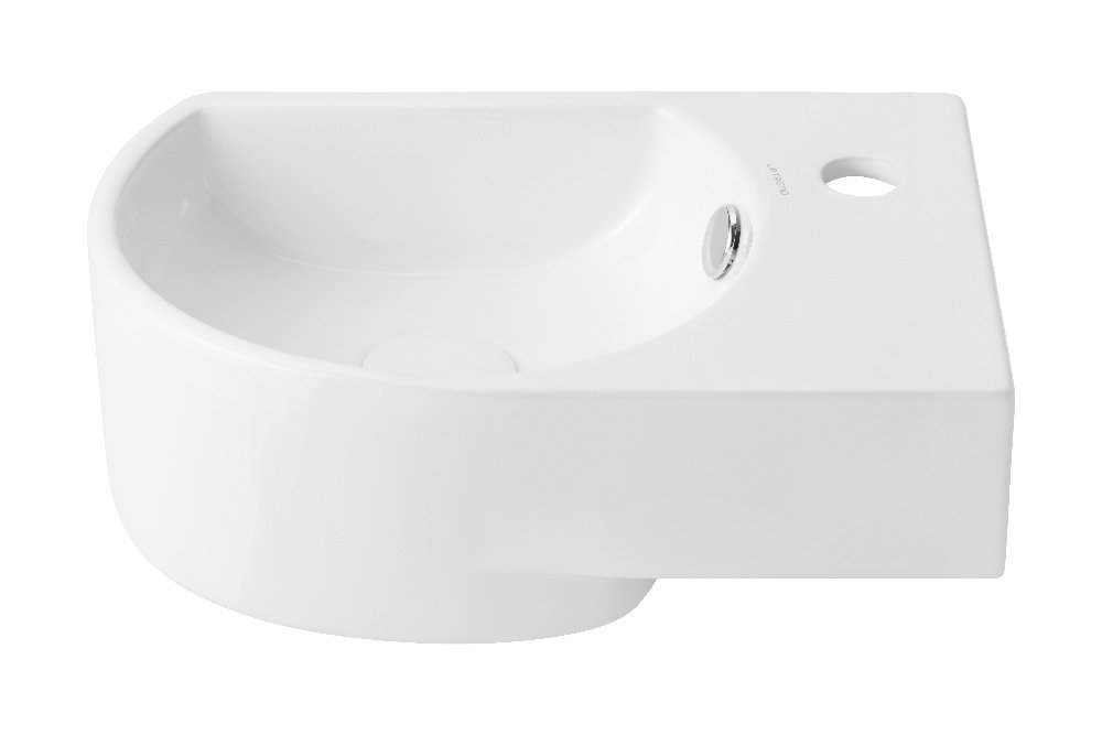 Malé keramické umývadlo určené pre úzke kúpeľne alebo toalety, s montážou na stenu a pravostranným otvorom pre batériu.