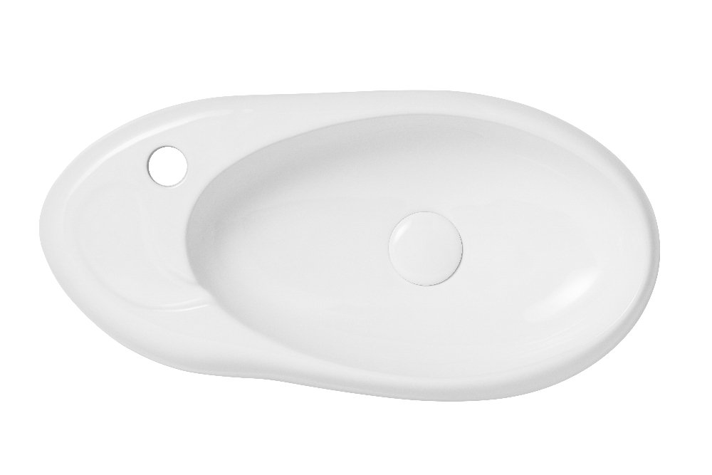 Elegantné keramické umývadlo s moderným dizajnom, určené na montáž na stenu alebo dosku, s otvorom pre batériu vľavo.