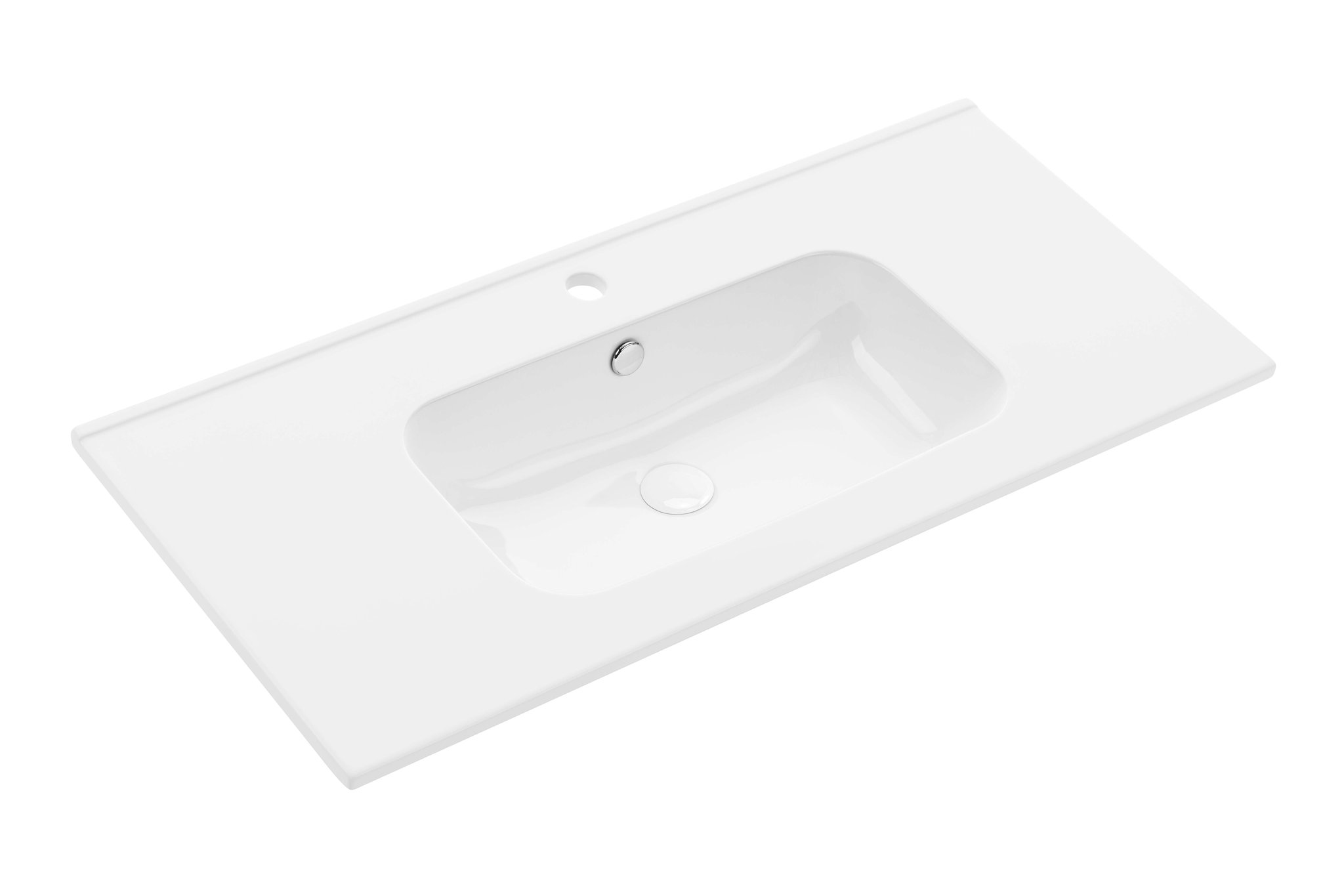Štýlové keramické umývadlo s otvorom pre batériu a prepadom, určené na kúpeľňový nábytok alebo zapustenie do dosky.