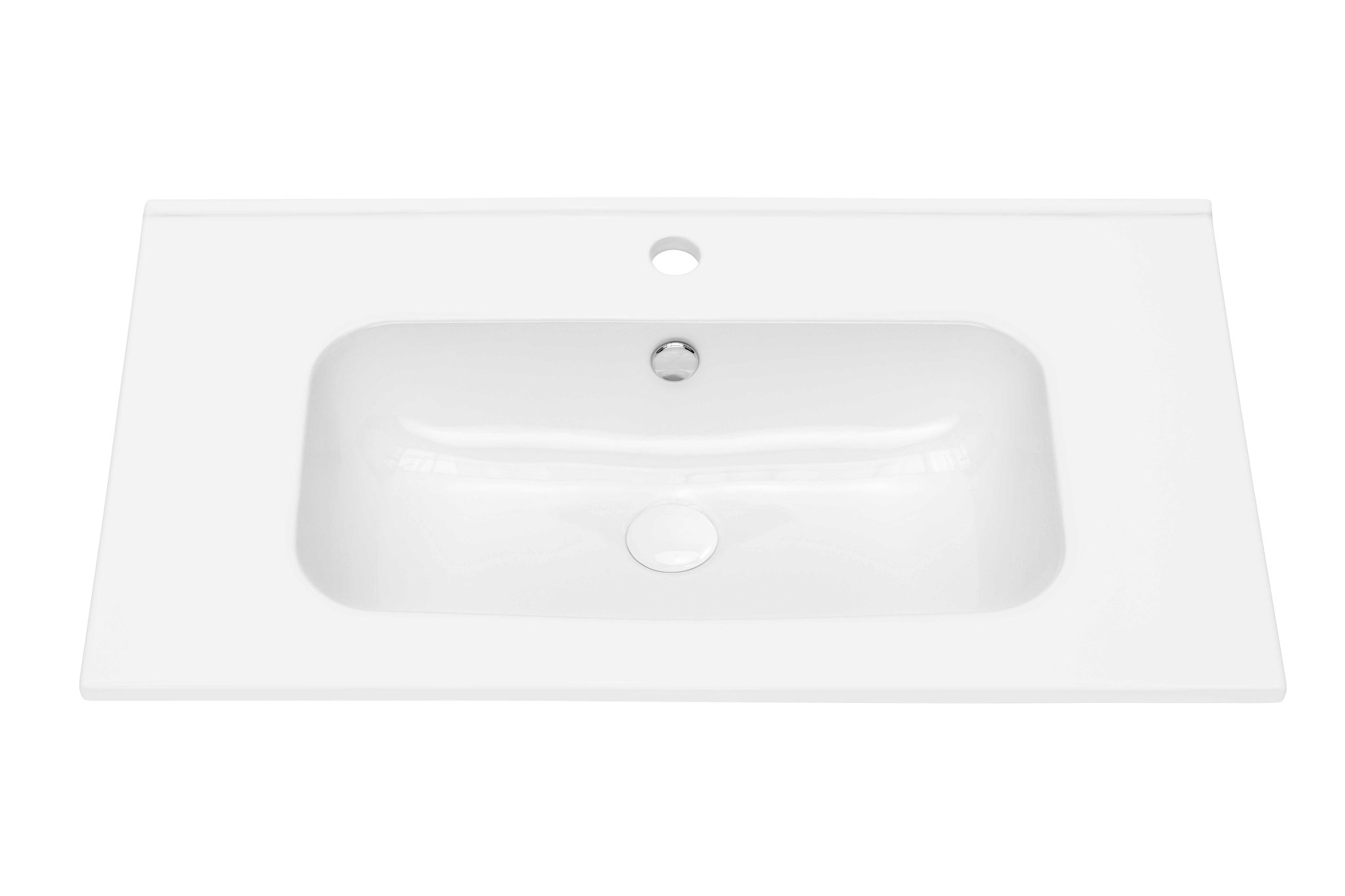 Štýlové keramické umývadlo s otvorom pre batériu a prepadom, určené na kúpeľňový nábytok alebo zapustenie do dosky.